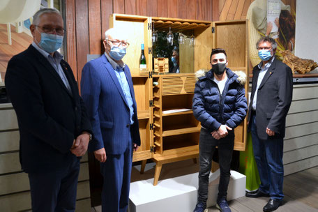 Bildunterschrift: Der Dritte Mohammad Karoom (2.v.r.) zusammen mit Landesinnungsmeister Stefan Zock (r.), dem Obermeister der Schreiner-Innung Trier-Saarburg Rainer Adams (l.) und Tischerrheinland-pfalz-Geschäftsführer Hermann Hubing (2.v.l.).