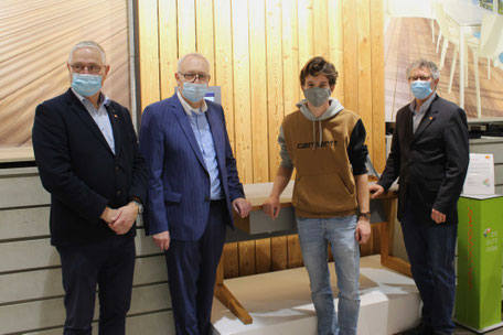 Bildunterschrift: Jakob Claußen (2.v.r.) gewann mit seinem Gesellenstück den Landesentscheid Die Gute Form in Rheinland-Pfalz. Hier zusammen mit Landesinnungsmeister Stefan Zock (r.), dem Obermeister der Schreiner-Innung Trier-Saarburg Rainer Adams (l.) und Tischerrheinland-pfalz-Geschäftsführer Hermann Hubing (2.v.l.).
