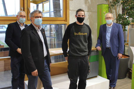 Bildunterschrift: Marius Winhausen (2.v.r.) zusammen mit Tischerrheinland-pfalz-Geschäftsführer Hermann Hubing (r.), dem Obermeister der Schreiner-Innung Trier-Saarburg Rainer Adams (l.) und Landesinnungsmeister Stefan Zock (2.v.l.).
